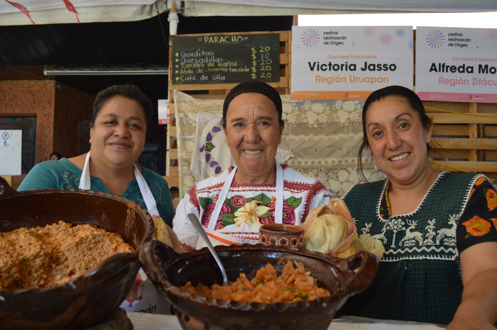 Aporreadillo, enchiladas con cecina, morisqueta, uchepos, atapakua, churipo, corundas, charales, papakata, olla podrida y sopa tarasca, serán algunos platillos que podrán degustar los asistentes, así como mole rojo, mole con de queso, pozole, trucha, asado de cerdo, birria, mole verde, atoles, chiles capones, tiritas de pescado, pulpo enamorado, ceviche de pescado, huazontle, espinazo de cerdo, frijoles puercos y chile de mango con queso, entre otros.